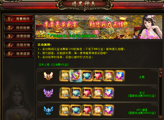 活动详情:活动期间元宝消费排行前100的角色(不低于88元宝)都有豪礼相赠。排行越高,奖励越丰厚,第一更有暗黑神兵奖励(随机开启1件暗黑武器/饰品/戒指/项链)。第一名最低消费8888元宝,第二名最低消费3000元宝,第三名最低消费2000元宝,需达标才有机会领取相应的奖励。