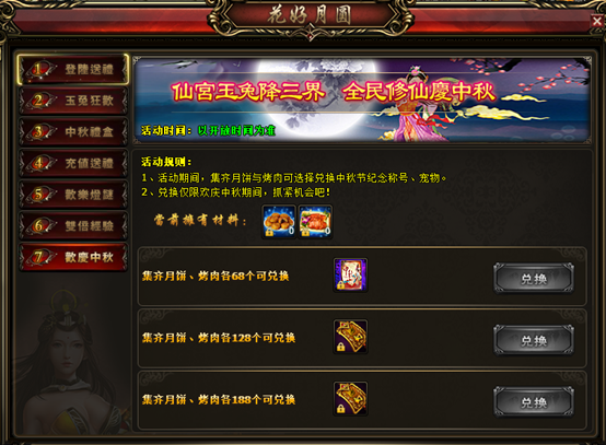 活动详情:活动期间活动面板出售三个中秋礼盒,每个礼盒每天都有一次购买机会。