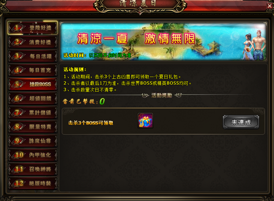 活动详情:活动期间,每击杀3个上古凶兽即可领取一个夏日礼包,击杀者以最后1刀为准,击杀世界BOSS或精英BOSS均可,击杀数量次日不清零。