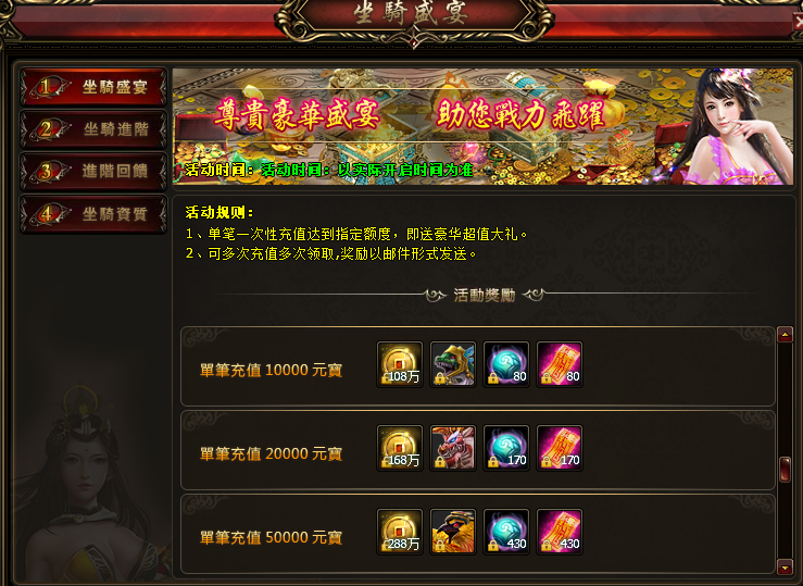 1、活动期间,当天充值的玩家坐骑总阶数达到指定要求即可领取大量奖励。