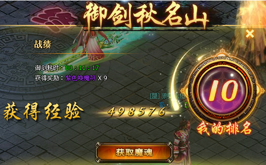 在前后夹击的竞速中,总算到达了终点。小编排名第10.哈哈得到了9个紫色唤魔符,这些可是价值100元宝的哦。
